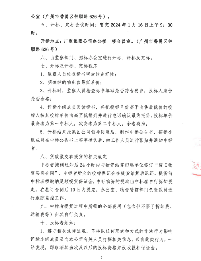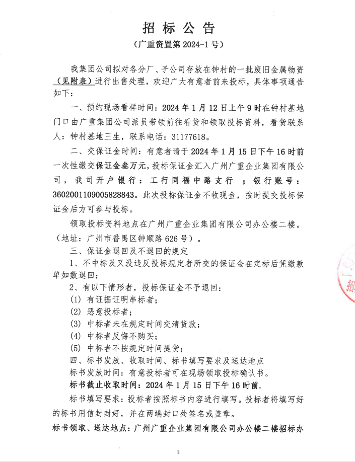 钟村废碳钢A、割渣类等物资处置(kaiyuan开元官方在线入口资置2024-1号)